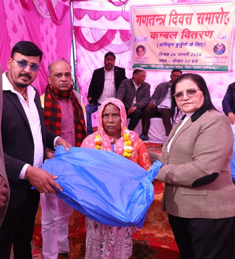 On the occasion of India’s 77th Republic Day, Chanchal Welfare Society, Maroli organized a compassionate community service initiative by distributing blankets to 51 elderly and dependent individuals, bringing warmth and dignity to those in need during winter. The program was graced by Shri Sitaram Numberdar, Sarpanch of Maha Gram Panchayat Banchari, and jointly presided over by Shri Satyanarayan Dubey, President of Heritage of India, and Smt. Chanchal Kem, Chairperson of the Society. The initiative was widely appreciated by dignitaries and community members, reflecting the organization’s commitment to service, social harmony, and true patriotism.
